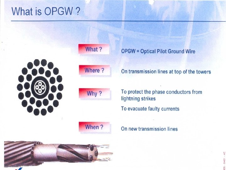 THE PRESENTATION What this presentation is about? This presentation is about giving a broad idea about the concepts of Optical Fiber and OF Cables, (OPGW, Lashed cables, ADSS, Under Ground & Duct Cables ) without going into the deep technicalities. So that as and when OF is being discussed the person who has attended this presentation is able to understand follow the discussion. Brief Flow of the Presentation. 1. What are Optical Fibers? 2. Advantages / Disadvantages of OF…. 3. Various Types of OF Cables. Their Construction , Specifications etc… 4. Some Test Equipments & Instruments used in OF Communications.