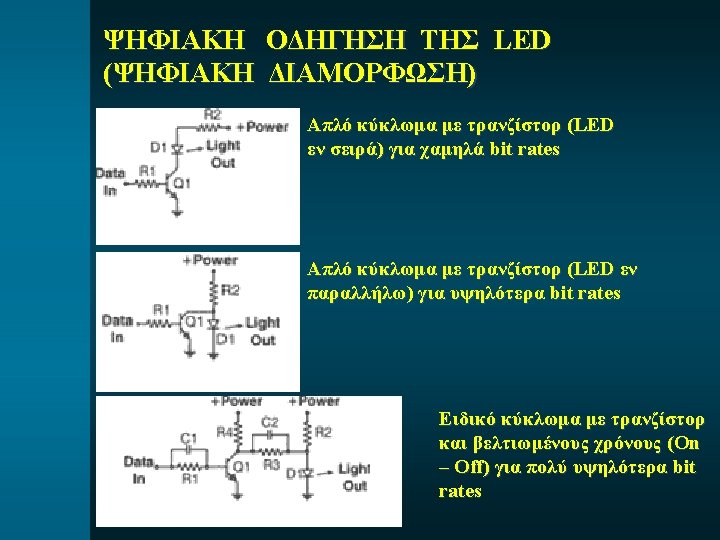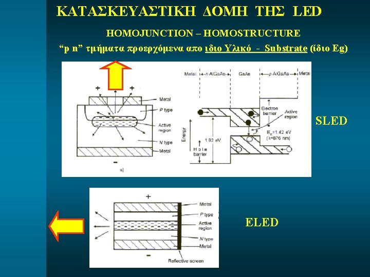 ΤΕΧΝΙΚΑ ΧΑΡΑΚΤΗΡΙΣΤΙΚΑ ΤΗΣ LED Active Material Type Radiating wavelengt h (nm) Spectral width (nm) Output power into fiber (µW) Forward current (m. A) Rise/fall time (ns) AIGa. As SLED 660 20 190– 1350 20(min) 13/10 ELED 850 35– 65 10– 80 60– 100 2/2– 6. 5/6. 5 SLED 850 40 80– 140 100 — ELED 850 35 10– 32 100 6. 5/6. 5 SLED 1300 110 10– 50 100 3/3 ELED 1300 25 10– 150 30– 100 1. 5/2. 5 ELED 1550 40– 70 1000– 7500 200– 500 0. 4/0. 4– 12/12 Ga. As In. Ga. As. P ΓΙΑ ΜΙΑ LED TO ΓΙΝΟΜΕΝΟ “BW * PO ” = ΣΤΑΘΕΡΟ