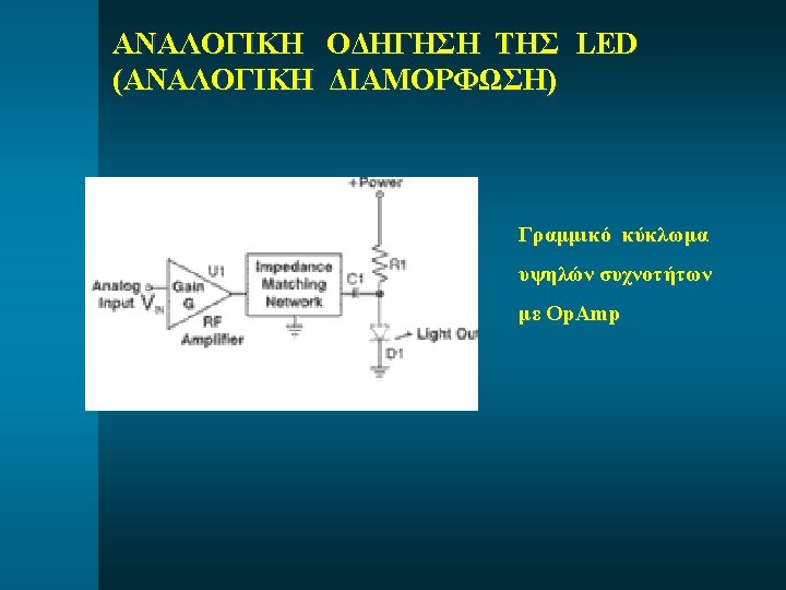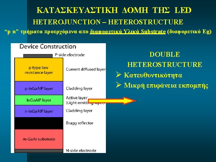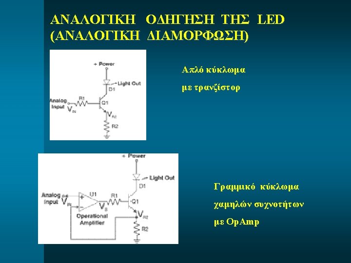 LED: ΥΛΙΚΑ ΚΑΙ ΕΚΠΕΜΠΟΜΕΝΟ «λ» Material Formula Energy Gap (Eg) Wavelength (λ) Gallium Phosphide Ga. P 2. 24 e. V 550 nm Aluminum Arsenide AIAs 2. 09 e. V 590 nm Gallium Arsenide Ga. As 1. 42 e. V 870 nm Indium Phosphide In. P 1. 33 e. V 930 nm Aluminum. Gallium Arsenide AIGa. As 1. 42 -1. 61 e. V 770 -870 nm Indium-Gallium. Arsenide. Phosphide In. Ga. As. P 0. 74 -1. 13 e. V 1100 -1670 nm