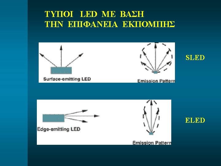 ΓΩΝΙΑ ΚΑΙ ΛΟΒΟΣ ΕΚΠΟΜΠΗΣ ΤΗΣ LED SLED Πηγή εκπομπής τύπου Lambertian P = P 0 cosθ θ ΗETEROSTRUCTURE θ ELED HOMOSTRUCTURE