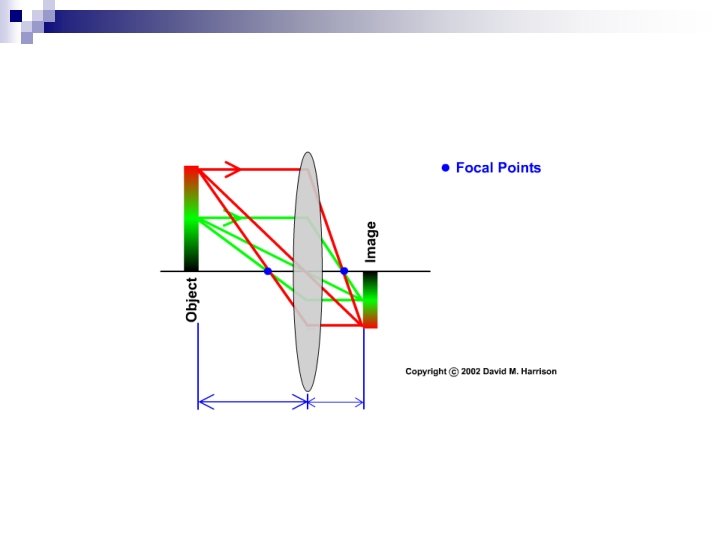 Persamaan Lensa Tipis Dari analisa persamaan lensa tipis didapat hubungan dimana O adalah jarak benda, I jarak bayangan, f adalah panjang fokus lensa, h adalah tinggi benda dan h’ adalah tinggi bayangan. Nisbah h’ dan h disebut perbesaran diberi simbul M