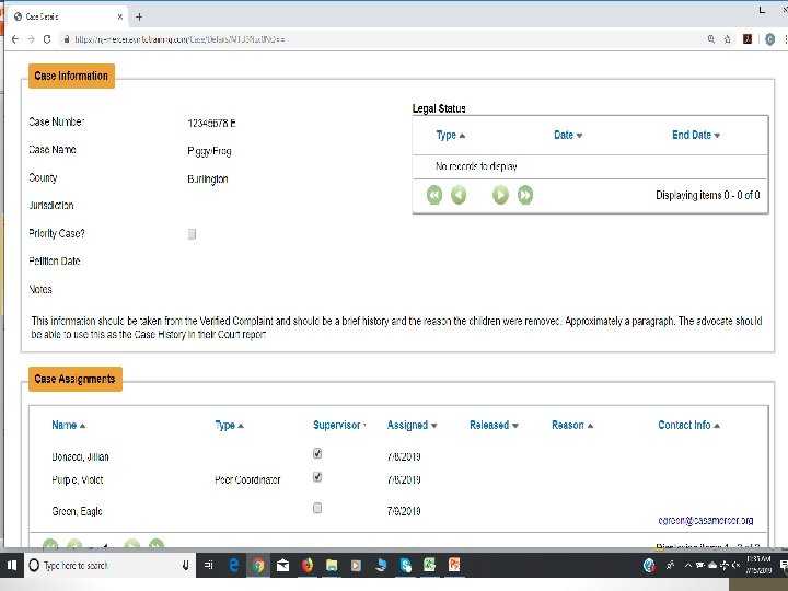 Details of the Case File • Case Information • • Case Number Case Name Petition Date Notes • This should be approximately a paragraph • Basic history of case • Should be used as the History in court report • Case assignments – shows who is attached to the case • Supervisor • Peer Coach (if applicable) • Volunteer