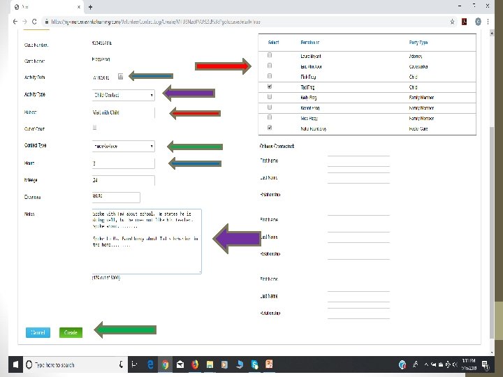 Contact Logs, cont. • Step 9: Notes • • • This section should include what was discussed It does NOT have to be the conversation verbatim It should be enough that anyone can know what happened Please do not just write – Visited with child You should be able to review your notes to use for your report • Step 10: Contact box on the right • Check off any individuals you spoke with during the encounter • The Child should be checked off on EVERY contact log • Step 11: Click Create