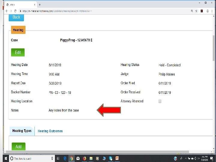 Hearings, cont. • Most of this information is provided by the Supervisor • HOWEVER – it is your responsibility to check it often to: • Ensure when your report is due • When you are to be in court • After the court date, the notes from the hearing • To see anything from the court hearing, Click on the Magnifying glass -