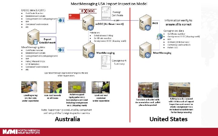 IMPORT DISTRIBUTION MEAT MESSAGING GS 1 BARCODE SYSTEM USDA INSPECTION This dispatch process is authenticated by the Australian government through the issuance of export certificates as well as container sealing. The US government confirms the authenticity and safety of goods. Temperature is monitored at all times throughout the supply chain. DISPATCH CONTAINER The container is not reopened until it reaches its port of destination. Cartons of meat are unloaded from refrigerated containers which are then inspected by the US government. E AUSTRALIAN GOVT TO U. S. GOVT CONTAINER OPENING Australian e Cert for meat products to US Customs and USDA. Cartons re inspected by USDA utilizing GS 1 barcoding for verification through Meat Messaging Notice 37 19. Temperature Monitoring Import Re-inspection Distribution Channels