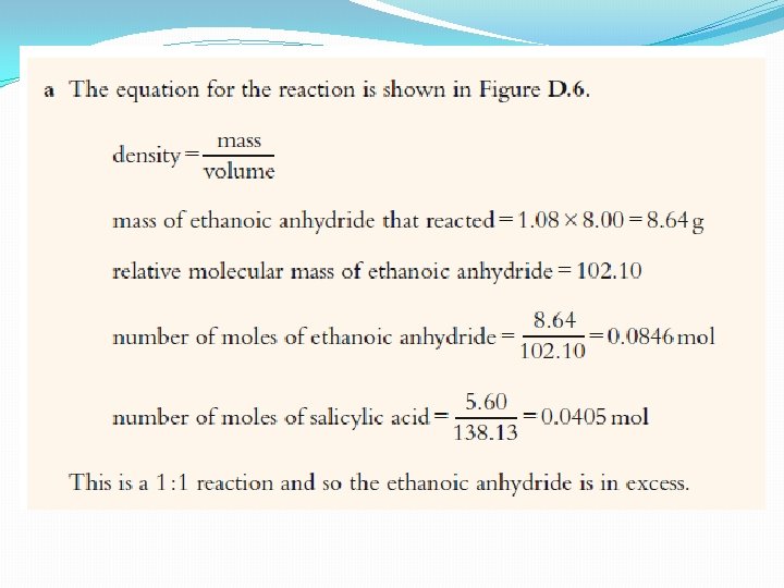 Example page 11 �D. 1 In an experiment to synthesise aspirin, 5. 60 g of salicylic acid (Mr 138. 13) was reacted with 8. 00 cm 3 ethanoic anhydride (density 1. 08 g cm− 3) in the presence of a concentrated phosphoric acid catalyst. 5. 21 g of a white solid was obtained at the end of the reaction. Calculate: �a which reagent was in excess �b the yield of aspirin.