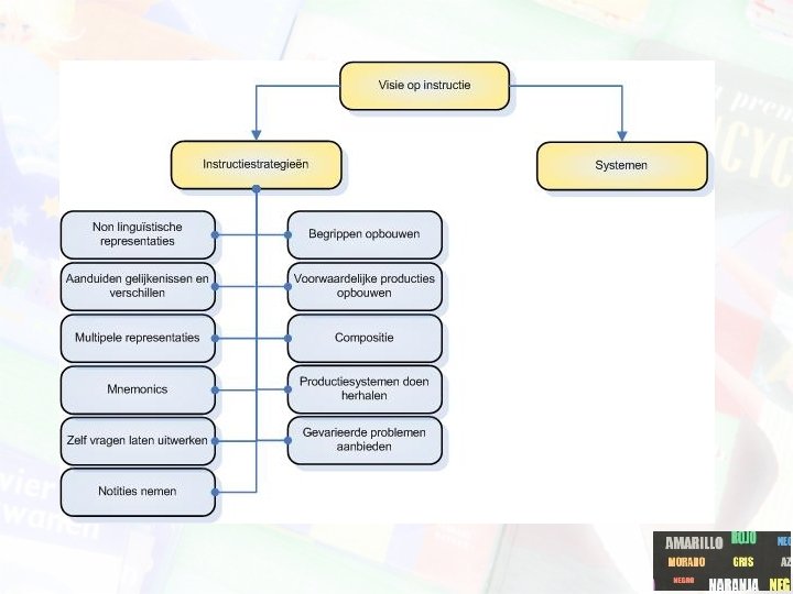 Combineren van instructiestrategieën • • Strategieën niet geïsoleerd gebruiken. Combineren. Stap-voor-stap opbouwen. Bijvoorbeeld – Verwerken complexe tekst • • Tekening Mindmap Korte samenvatting Analogie uitwerken of metafoor