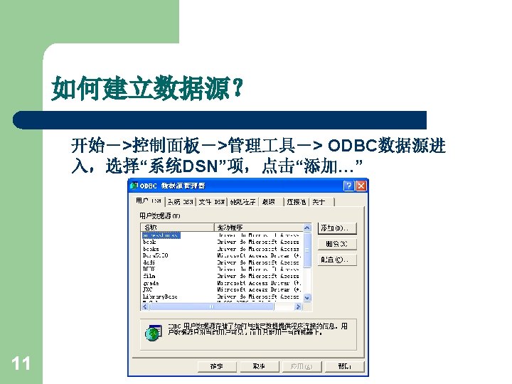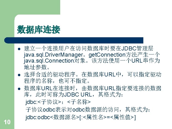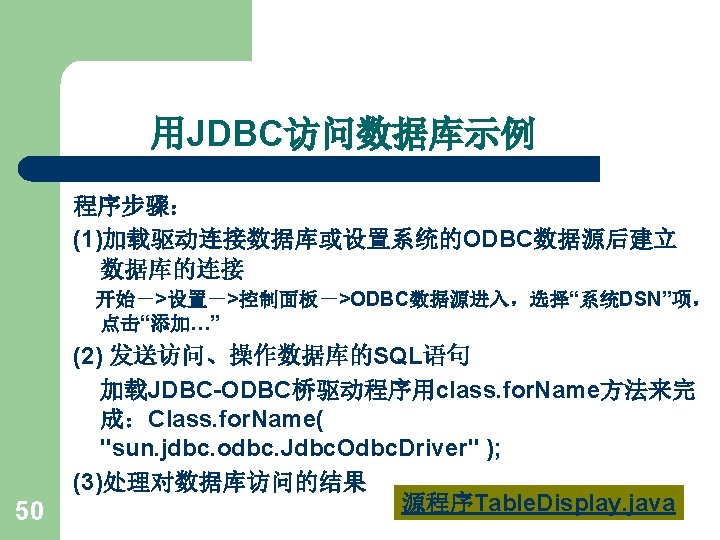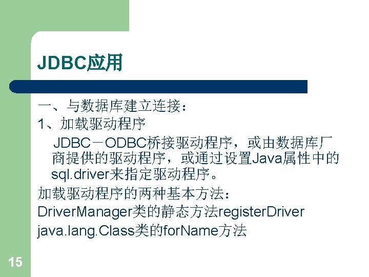 加载Access驱动程序 Driver. Manager. register. Driver(new sun. jdbc. odbc. Jdbc. Odbc. Driver()); 或 Class. for. Name("sun. jdbc. odbc. Jdbc. Odbc. Driver") ; 22
