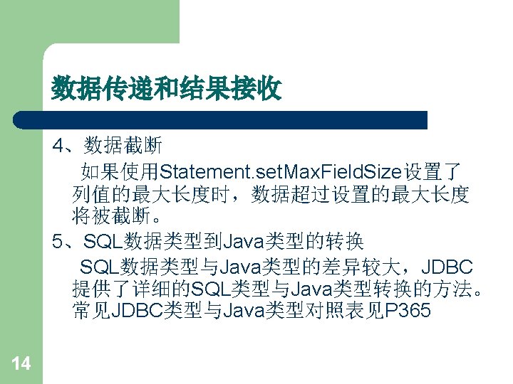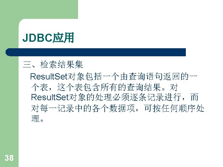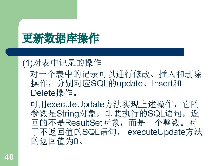 检索结果集的例子 假设表table由数据项a, 类型为int;数据项b,类型为 String,数据项c,类型为byte Statement stmt=con. create. Statement(); Result. Set r=stmt. execute. Query(“select a, b, c from table”); while(r. next()){ int i=r. get. Int(1); String s=r. get. String(“b”); byte b[]=r. get. Bytes(3); System. out. println(i+s+b[0]); } l 39