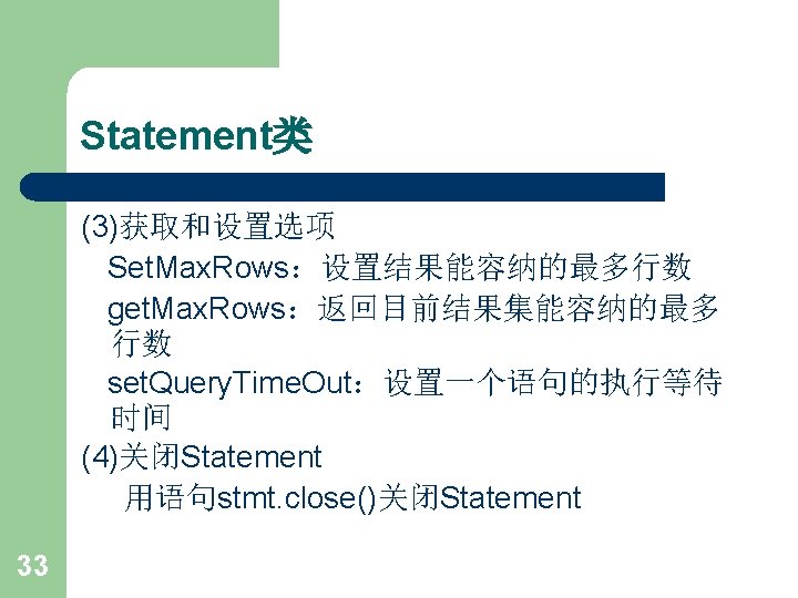 Statement类 (1)创建Statement对象主要用于语句的查询。建立一个 Statement对象语句如下: Statement stmt=con. Create. Statement(); (2)执行查询语句 在Statement对象上,可使用execute. Query方法来执 行一查询语句,如: Result. Set rs=stmt. execute. Query(“Select * from Authors”); 32