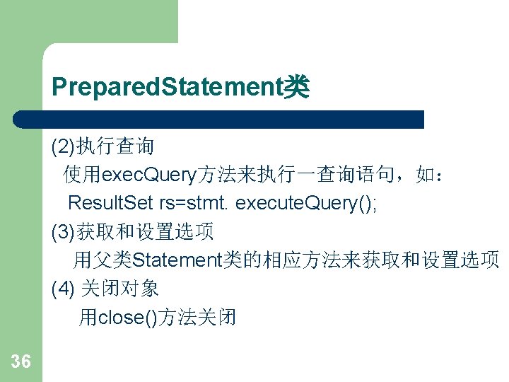Prepared. Statement类是Statement类派生的子类。 (1)创建Prepared. Statement对象 l 从一个Connection对象可以创建一个Prepared. Statement 对象。在创建时,应给出预编译的SQL语句,如: Prepared. Statement stmt=con. Prepared. Statement (“Select * from Authors”); 35