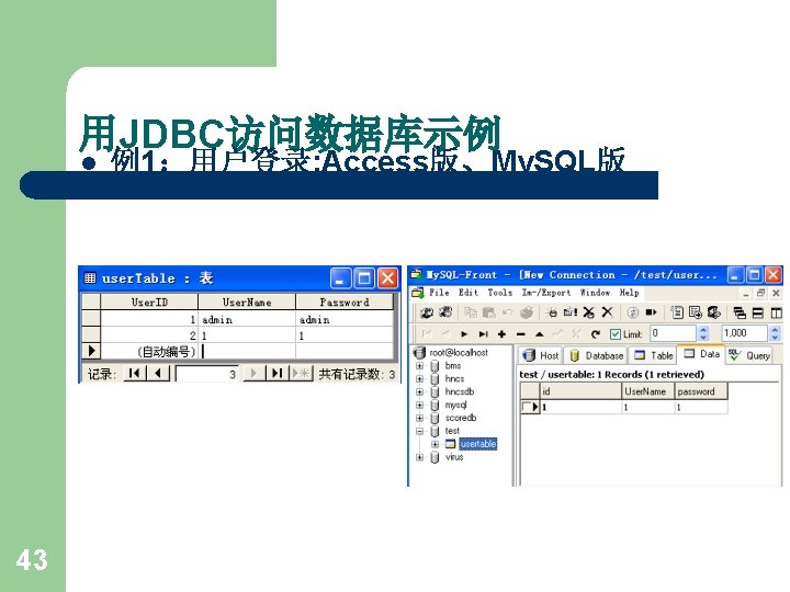 增加和删除表结构中的数据项 对一个表的数据项进行修改操作使用SQL的 Alter table语句。 如在表Authors中增加一数据项Address: l stmt. execute. Update(“alter table Authors add column Address varchar(50)”); 删除表中一列: stmt. execute. Update(“alter table Authors drop column Address”); 42