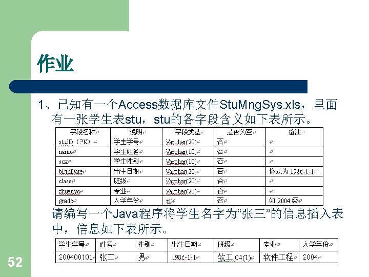 性能优化 l 预编译语句 sql="INSERT INTO film 1 (filmdata) VALUES (? )"; stmt=c. prepare. Statement(sql); for (int i=1; i<=20000; i++){ stmt. set. String(1, ""+i); stmt. execute. Update(); } l SQL语句批处理机制 stmt=c. create. Statement(); for (int i=1; i<=20000; i++){ sql="INSERT INTO film 1 (filmdata) VALUES ('"+i+"')"; stmt. add. Batch(sql); } stmt. execute. Batch(); 51