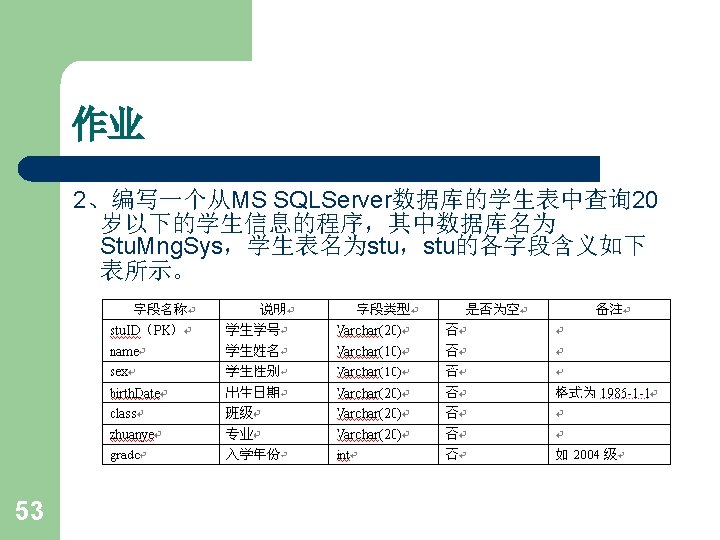 更新数据库操作 (2) 创建和删除表 创建表:Create table 表名 删除表:Drop table 表名 如创建数据库表Authors: stmt. execute. Update(“create table Authors(Author. ID int, First. Name char(20), Last. Name char(20), Year. Born int”); 删除表Authors的语句: stmt. execute. Update(“drop table Authors“); 41