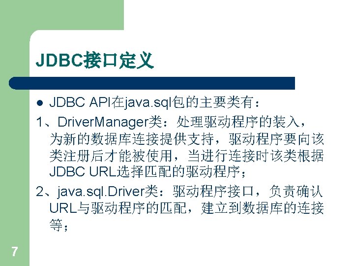 加载MS SQL Server JDBC驱动程序 Driver. Manager. register. Driver(new com. microsoft. jdbc. sqlserver. SQLServer. Driver ()); 或 Class. for. Name(“com. microsoft. jdbc. sqlserver. SQLServ er. Driver”) 17