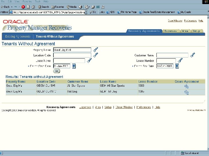 Oracle Property Manager Ÿ Property Definition Ÿ Space Management Ÿ Lease Administration Ÿ User Definable Billing and Payment Terms Ÿ Rent Increases Ÿ Variable Rent Ÿ Recoveries Ÿ Full Integration to Receivables and Payables