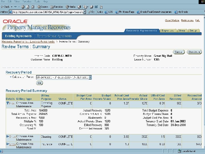 Recoveries Value Propositions Ÿ Automates process of CAM billing and reconciliation Ÿ Minimizes errors throughout the recovery calculation Ÿ Ensures complete recovery of all CAM and other expenses through integration with Oracle General Ledger