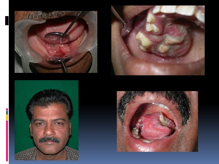 Intra-oral examination Growth Endophytic Exophytic Ulcer and white patches Number, site, extent, shape, size, margins, floor & base, degree of soft tissue, bone and skin involvement, surrounding induration Degree of mouth opening, restriction of tongue movements Confirmation – incisional biopsy/bone biopsy