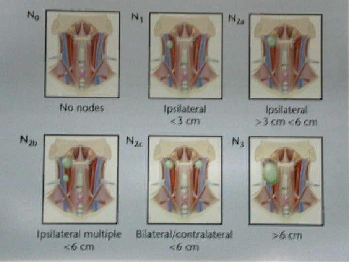 NX REGIONAL LYMPH NODES CANNOT BE ASSESSED N 0 THERE IS NO REGIONAL NODES METASTASIS N 1 METASTASIS IS IN A SINGLE IPSILATERAL LYMPH NODE, 3 CM LESS IN GREATEST DIMENSION OR N 2 METASTASIS IS IN A SINGLE IPSILATERAL LYMPH NODE, MORE THAN 3 CM BUT NOT MORE THAN 6 CM IN GREATEST DIMENSION; OR METASTASIS IS IN MULTIPLE IPSILATERAL NODES, NONE MORE THAN 6 CM IN GREATEST DIMENSION; OR METASTASIS IS IN BILATERAL OR CONTRALATERAL LYMPH NODES, NONE GREATER THAN 6 CM IN GREATEST DIMENSION N 2 a METASTASIS IS IN A SINGLE IPSILATERAL LYMPH NODE, MORE THAN 3 CM BUT NOT MORE THAN 6 CM IN GREATEST DIMENSION N 2 b METASTASIS IS IN MULTIPLE IPSILATERAL LYMPH MORE THAN 6 CM IN GREATEST DIMENSION NODES, NONE N 2 c METASTASIS IS IN BILATERAL OR CONTRALATERAL LYMPH NODES, NONE MORE THAN 6 CM IN GREATEST DIMENSION N 3 METASTASIS IS IN A LUMPH NODE MORE THAN 6 CM IN GREATEST DIMENSION