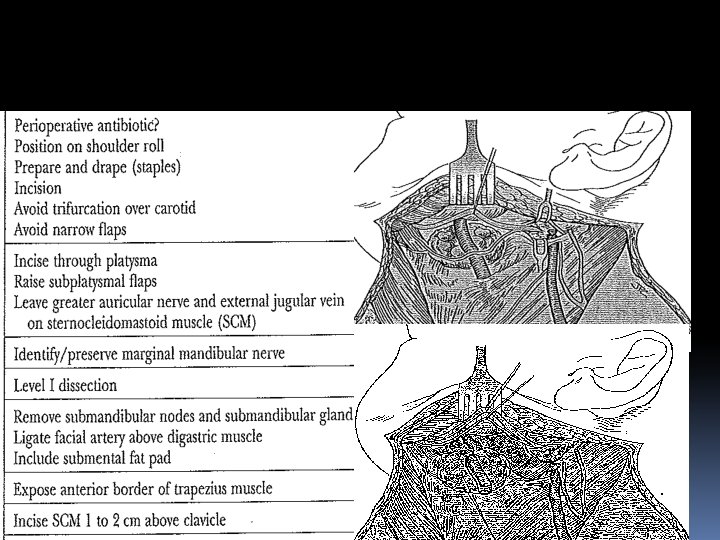 IN CASE OF EXTENSIVELY INVOLVED LYMPH NODES NECK DISSECTION IS INDICATED LYMPH NODES IN THE NECK ARE CLASSIFIED AS LEVELS I TO VII LEVEL IA SUBMENTAL GROUP LEVEL IB SUBMANDIBULAR GROUP LEVEL II UPPER JUGULAR GROUP LEVEL III MID-JUGULAR GROUP LEVEL IV LOWER JUGULAR GROUP LEVEL V POSTERIOR TRIANGLE GROUP LEVEL VI CENTRAL COMPARTMENT GROUP LEVEL VII SUPERIOR MEDIASTINAL GROUP