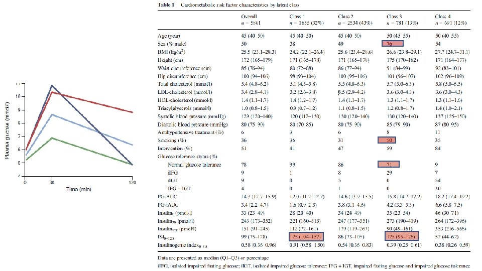 Sonuçlar • Gizli sınıfların belirlenmesi • OGTT sırasında dört farklı glikoz paterni tespit edildi. • Katılımcıların % 13'ünü temsil eden 3. sınıf, en yüksek 30 dk PG ancak en düşük 2 h. PG ile karakterize edildi. • Diğer üç sınıf, üç zaman noktasında plazma glikoz seviyeleri ile tutarlı bir şekilde sıralandı.