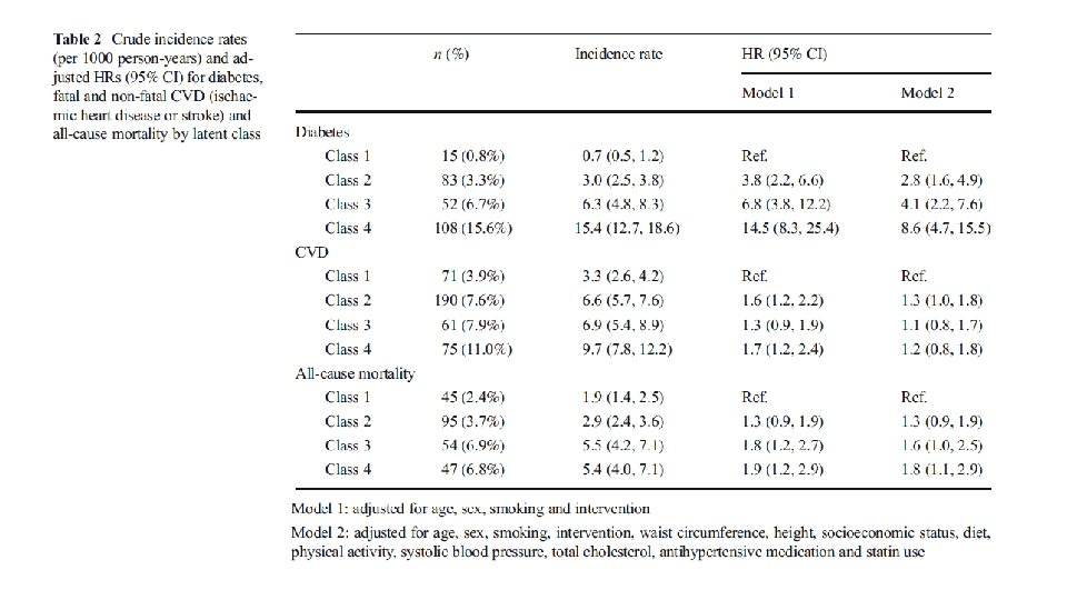 Yöntem • Diyabet, KVH ve sınıflar arasındaki ölüm riskini karşılaştırmak için iki değişken grubun ayarlanmasıyla Cox orantısal risk modelleri kullanıldı. • Model 1 yaş, cinsiyet, sigara içme durumu ve müdahale için ayarlandı. • Model 2, ek olarak bel çevresi, boy, sosyoekonomik durum, diyet, fiziksel aktivite, sistolik kan basıncı, total kolesterol, antihipertansif ilaç ve statin kullanımı için ayarlanmıştır.