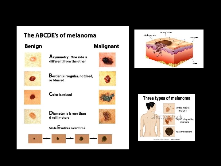 • Rate of growth slow • Vertical phase rapid • Usually painless • Rapid infiltration fixed to underlying tissues • Spread lymphatic & hematogenous routes • Many develop from nevi