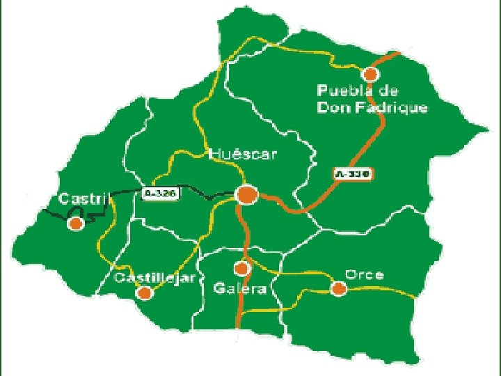 SITUATION GÉOGRAPHIQUE • Orce se situe au nord de la province de Grenade, dans la limite avec Almería. • Elle a une population de 1. 475 habitants, répartis entre le centre-ville et les annexes de Fuentenueva, de Vente Micena, et Puits de la roue. • Son économie traditionnelle a été basée sur l'agriculture et sur l’élevage, on remarque l'Agneau Segureño, très apprécié par son goût incomparable. • Orce se trouve dans la Contrée de Huéscar, (dans la Contrée de Baza), avec les municipalités le Puebla de D. Fadrique, Huéscar, Castillejar, Castril et Galera • Les deux Contrées, Huéscar et Baza, forment le Haut Plateau de Grenade.