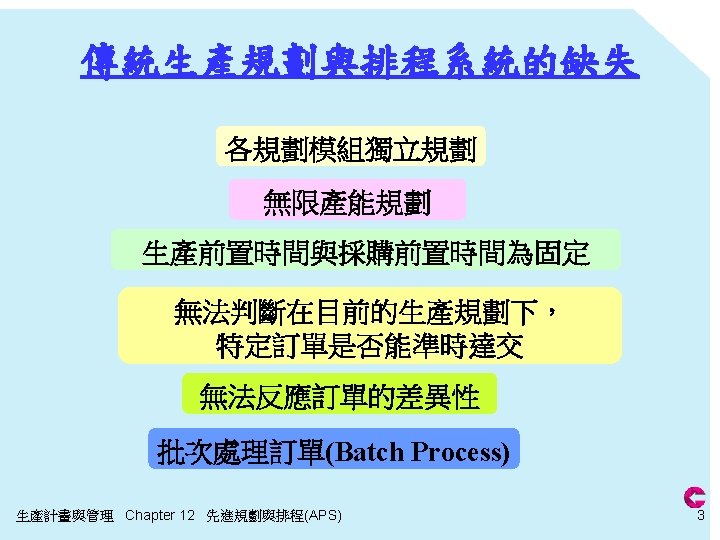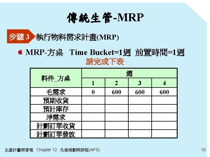 傳統生管- RCCP 步驟 2 執行粗略產能計畫(RCCP) RCCP-產能清單法 作中心 WS 1 WS 2 WS 3 總和 第二週 (min) 6000 14400 12000 32400 第三週 (min) 6000 14400 12000 32400 預計各 作中心 每周可用產能 比例 (min) 18. 52% <1440*7 44. 44% <3360*7 37. 04% <2400*7 100% • 各 作站所需產能 : 10*1*600=6000 6*4*600=14400 20*1*600=12000 • WS 3 每天可用產能 = 8*60*5 = 2400 生產計畫與管理 Chapter 12 先進規劃與排程(APS) 9