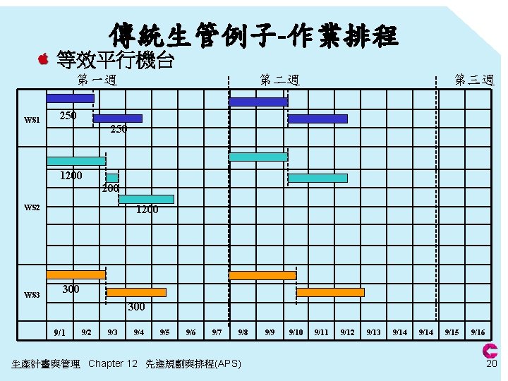 傳統生管-CRP 步驟 4 產能需求計畫(CRP) 再加上已發放的 單之產能負荷 作中心 WS 1 WS 2 WS 3 週 1 41. 7 hr + 41. 7 hr 120 hr + 140 hr 100 + 100 hr 可用產能 2 3 4 100 hr 0 0 <24*7*100 240 hr 0 0 <56*7*100% 200 hr 0 <40*7*100 生產計畫與管理 Chapter 12 先進規劃與排程(APS) 19