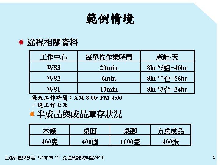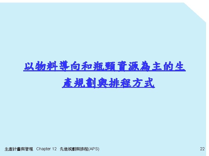 傳統生管-CRP 步驟 4 產能需求計畫(CRP) 計劃訂單發放彙總表 週 1 2 桌面(WS 1) 250 600 桌腳(WS 2) 1200 2400 方桌(WS 3) 300 600 計劃訂單發放之產能負荷表 3 0 0 600 4 0 10 min * 600=100 hr 06 min * 2400=240 hr 020 min* 600=200 hr 週 1 WS 2 WS 3 2 Setup Run 0 0 0 41. 7 120 100 3 Setup Run 0 0 0 生產計畫與管理 Chapter 12 先進規劃與排程(APS) 100 240 200 Setu p 0 0 0 4 Run Setup Run 0 0 200 18