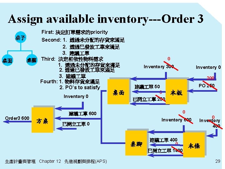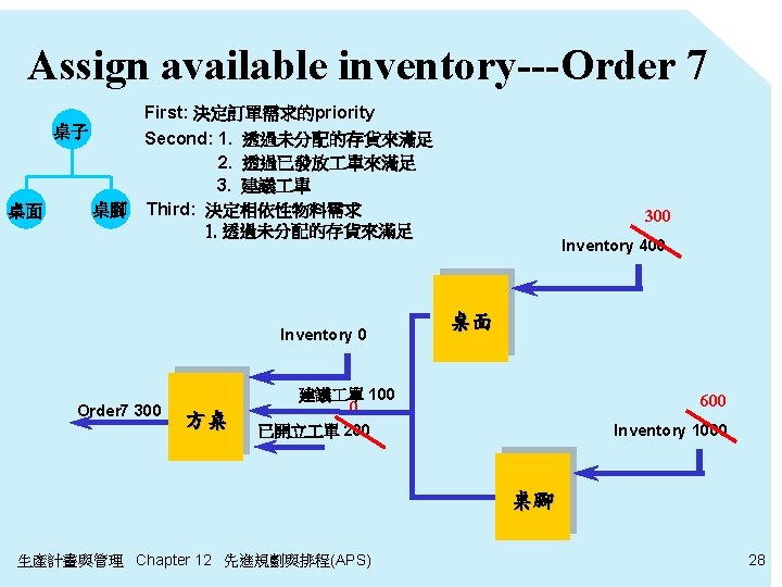 Assign available inventory---Order 6 First: 決定訂單需求的priority Second: 1. 透過未分配的存貨來滿足 2. 透過已發放 單來滿足 桌子 桌面 桌腳 0 Inventory 100 Order 6 200 方桌 200 已開立 單 300 生產計畫與管理 Chapter 12 先進規劃與排程(APS) 27