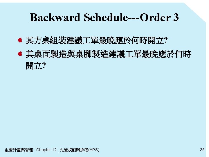 Forward Schedule---Order 7 交期=9/8 AM 8: 00 Qty: 300 其建議組裝 單最早可於何時開立? 需100個木板 (由庫存滿足) 組裝時間=6. 67 hr 需400個木條 (由庫存滿足) Order 7 完 時間 = 9/1 PM 2: 40 Qty: 300 EPST=9/1 AM 8: 00 Forward Scheduling 生產計畫與管理 Chapter 12 先進規劃與排程(APS) 34