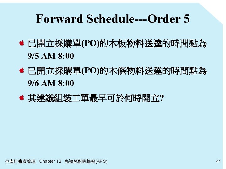 需200個木板 (由PO滿足) 桌面製造時間 = 11. 1 hr LPST=9/12 PM 3: 33 組裝時間 = 13. 3 hr LPST=9/12 PM 3: 20 Order 5 交期=9/16 AM 8: 00 Qty: 200 LPST=9/14 AM 10: 40 桌腳製造時間 = 11. 4 hr 需800個木條 (由PO滿足) Backward Scheduling 生產計畫與管理 Chapter 12 先進規劃與排程(APS) 40