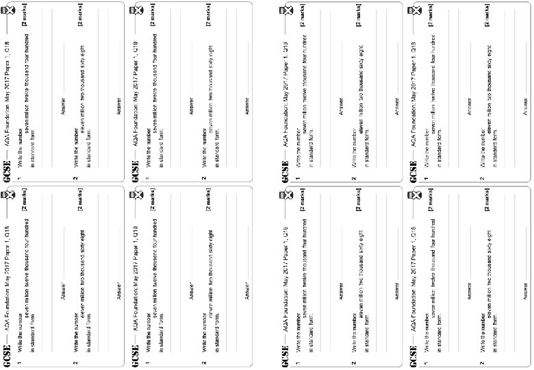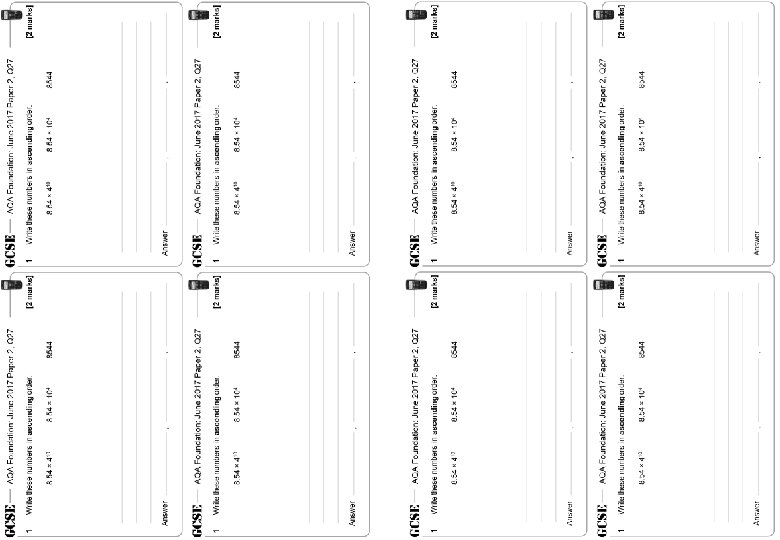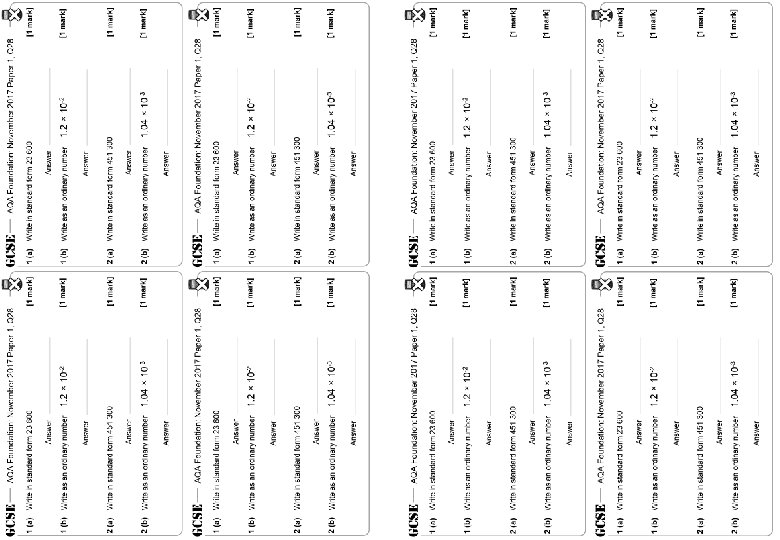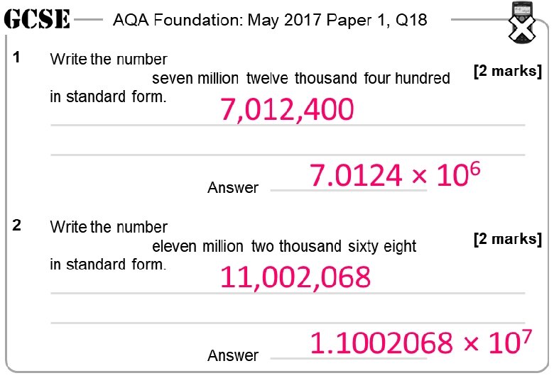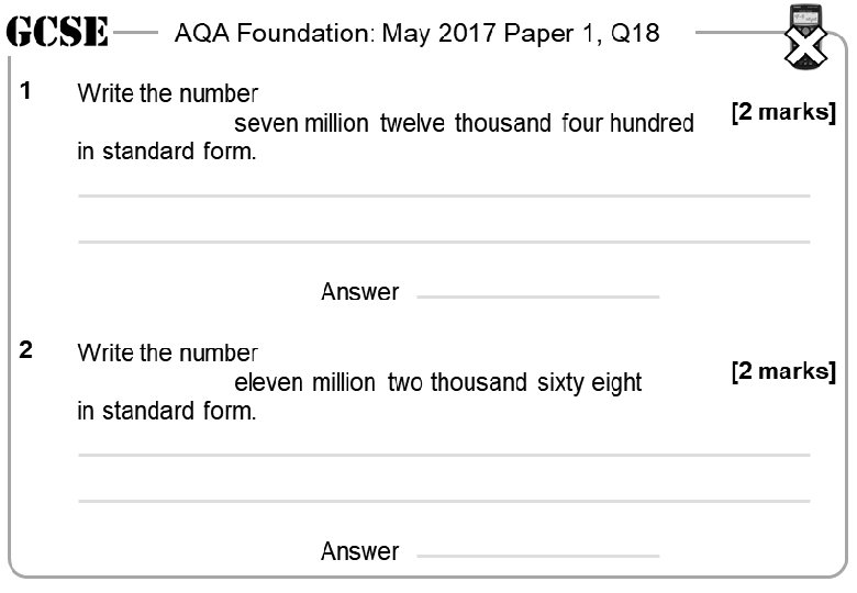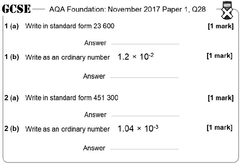 Ordinary Numbers to Standard Form – Foundation – GCSE Questions – AQA These questions are the same format as previous GCSE exams. COPY means they use the exact same numbers as the original GCSE question. Otherwise, they are clone questions using different numbers. The worksheets are provided in 2 sizes.