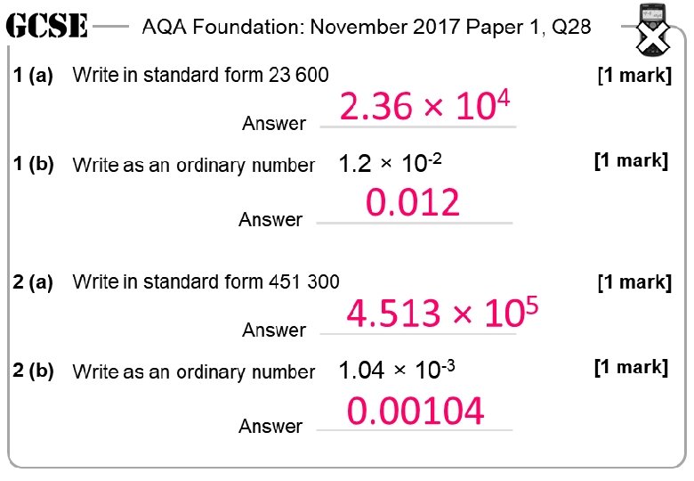 AQA Foundation: November 2017 Paper 1, Q 28 1 (a) Write in standard form 23 600 AQA Foundation: November 2017 Paper 1, Q 28 [1 mark] Answer 1 (b) Write as an ordinary number 1. 2 × 10 -2 [1 mark] Answer 1. 04 × 10 -3 [1 mark] 2 (a) Write in standard form 451 300 [1 mark] 2 (b) Write as an ordinary number 1. 04 × 10 -3 [1 mark] Answer AQA Foundation: November 2017 Paper 1, Q 28 1 (a) Write in standard form 23 600 AQA Foundation: November 2017 Paper 1, Q 28 [1 mark] Answer 1 (a) Write in standard form 23 600 [1 mark] Answer 1. 2 × 10 -2 [1 mark] Answer 1 (b) Write as an ordinary number 1. 2 × 10 -2 [1 mark] Answer 2 (a) Write in standard form 451 300 [1 mark] Answer 1. 2 × 10 -2 Answer 2 (b) Write as an ordinary number 1 (b) Write as an ordinary number Answer 2 (a) Write in standard form 451 300 1 (b) Write as an ordinary number [1 mark] Answer 2 (b) Write as an ordinary number 1 (a) Write in standard form 23 600 2 (a) Write in standard form 451 300 [1 mark] Answer 1. 04 × 10 -3 [1 mark] 2 (b) Write as an ordinary number Answer 1. 04 × 10 -3 [1 mark]