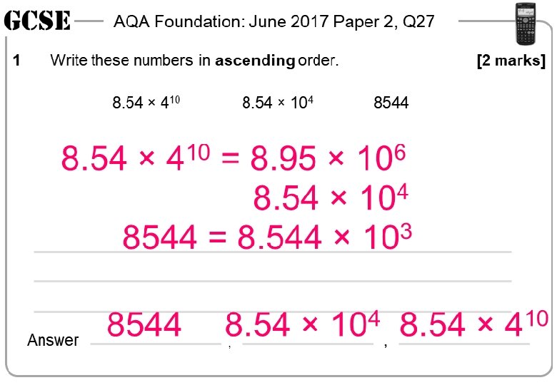 AQA Foundation: June 2017 Paper 2, Q 27 1 Write these numbers in ascending order. 8. 54 × 410 Answer 8. 54 × 104 AQA Foundation: June 2017 Paper 2, Q 27 [2 marks] 1 8544 8. 54 × 410 , , Write these numbers in ascending order. Answer AQA Foundation: June 2017 Paper 2, Q 27 1 Write these numbers in ascending order. 8. 54 × 410 Answer 8. 54 × 104 , 8544 , , AQA Foundation: June 2017 Paper 2, Q 27 [2 marks] 1 Write these numbers in ascending order. 8544 , 8. 54 × 104 [2 marks] 8. 54 × 410 Answer 8. 54 × 104 , [2 marks] 8544 ,
