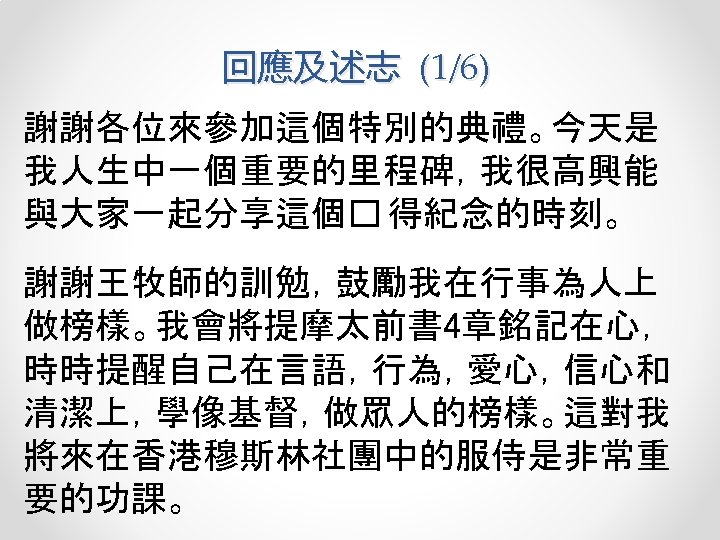 Scripture Reading 讀經 1 Tim 4: 10 -16 提摩太前書 4: 10 -16 13 Until I come, devote yourself to the public reading of Scripture, to preaching and to teaching. 14 Do not neglect your gift, which was given you through prophecy when the body of elders laid their hands on 13你要以宣讀、勸勉、教導為念,直等到我來。 14你不要輕忽所得的恩賜,就是從前藉著預 言、在眾長老按手的時候賜給你的。