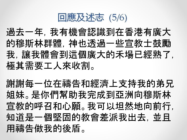 Missionary Examination Report 差傳考察報告 2/2 • Mission field in Hong Kong SAR, China • Mission organization is Pioneers www. pioneers. org • Minister to Muslim women and children (refugees, migrant workers, immigrants) • Plan to stay January 2017 -indefinite (at least 2 years) • Focus on education language tutoring of Muslim refugees and migrant workers (women and children), volunteer administration support for local Christian NGO, and hospitality/friendship ministry to the Muslim community.