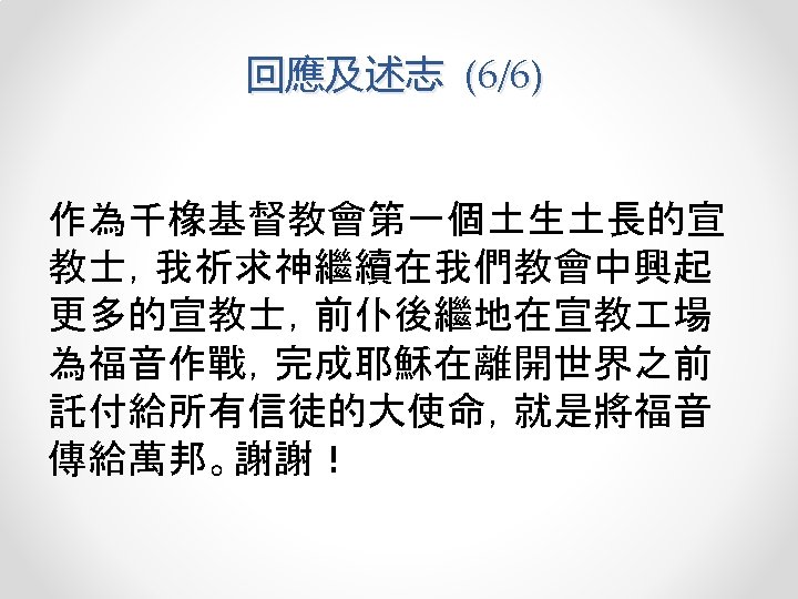 Scripture Reading 讀經 1 Tim 4: 10 -16 提摩太前書 4: 10 -16 15 Be diligent in these matters; give yourself wholly to them, so that everyone may see your progress. 16 Watch your life and doctrine closely. Persevere in them, because if you do, you will save both yourself and your hearers. 15這些事你要殷勤去做,並要在此專心,使 眾人看出你的長進來。16你要謹慎自己和 自己的教訓,要在這些事上恆心;因為這樣 行,又能救自己,又能救聽你的人。