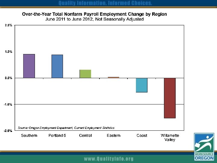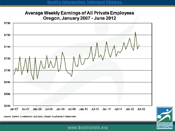 Reducing the unemployment rate? Based on OEA population projections and recent labor force participation rate: Steady: Average of +800 jobs per month keeps rate about 8. 5% Decline: Need to average +3, 300 per month to reach 7. 5% by 2015. Current: Averaged +2, 400 per month in January to June 2012. Note: changes in the rate of Baby Boomer retirements, in-migration to Oregon, and labor force participation have effects on these scenarios.