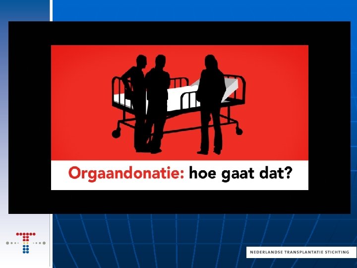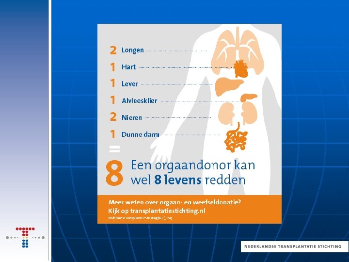 Twijfels/misverstanden n Ze zorgen niet goed voor mijn nabestaanden (geen afscheid, geen opbaring) n Er gaan studenten geneeskunde in me snijden n Registratie is niet meer te wijzigen n n Ze trekken “de stekker er uit” voordat ik dood ben/doen minder hun best voor me als ik als donor geregistreerd sta Hersendood is niet echt dood