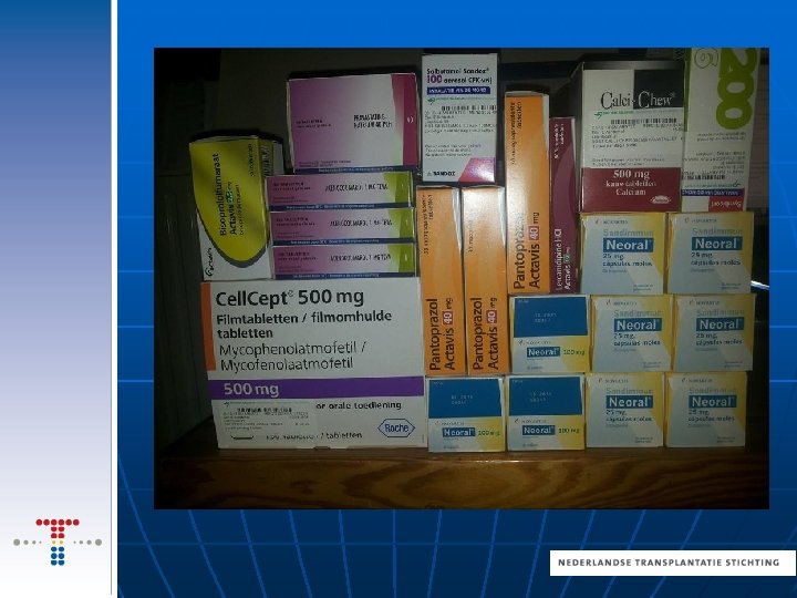 NA DE TRANSPLANTATIE n n n Medicijnen Fysiotherapie Infectie Bacterie arm voedsel Afstoting
