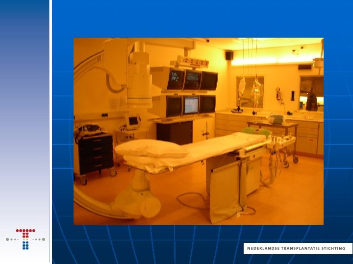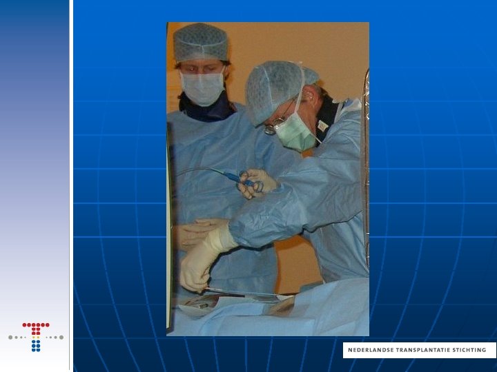 Wat gebeurd er met de donor: Hersendood wordt vastgesteld. Pas als overlijden onvermijdelijk is raadpleegt de arts het Donorregister De overleden donor blijft aan de beademing Zuurstof blijft door het lichaam stromen Familie kan nu afscheid nemen en kan ook na de uitname van de donororganen. De tijd tussen vaststellen van hersendood en het uitnemen van organen ligt tussen de 4 tot 12 uur. De TC legt de procedure uit aan de familie Het uitnameteam neemt de organen uit