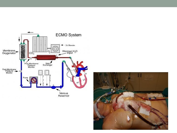 Specific Organ Support –ECMO • Extracorporeal Membrane Oxygentaion • Only used in acute, severe REVERSIBLE respiratory or cardiac failure, with a high risk of death, that is refractory to conventional management. • Only available in certain specialist centres • Blood is removed from the body, oxygenated by a machine, then returned. • Frequent and severe complications