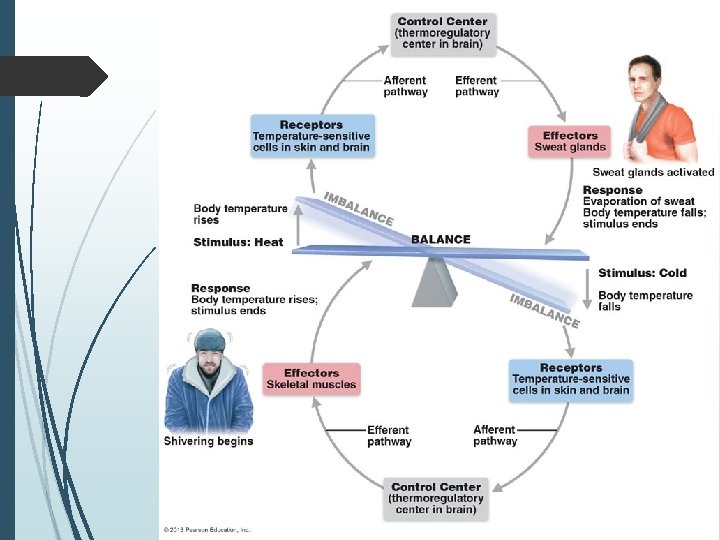 Homeostasis Dynamic equilibrium Almost all organs function to regulate homeostasis Achieved mainly through the endocrine and nervous systems Involve 3 components 1. Receptor- a sensor to monitor and respond to changes 2. Control center- determines set point and determines response 3. Effector- “feedback” to either reduce (negative feedback) or enhance (positive feedback) the effect of the stimulus