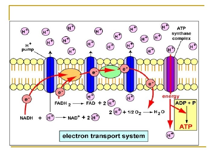 n n Elektron berenergi tinggi dari NADH → FADH → koenzim Q → sitokrom b, c → sitokrom a → molekul O 2 → berikatan dengan H → molekul air Energi terbesar dihasilkan oleh proses transport elektron