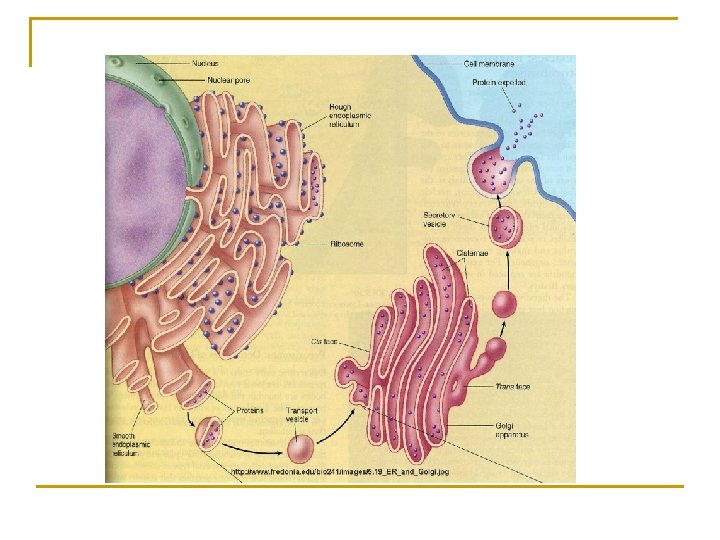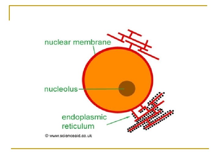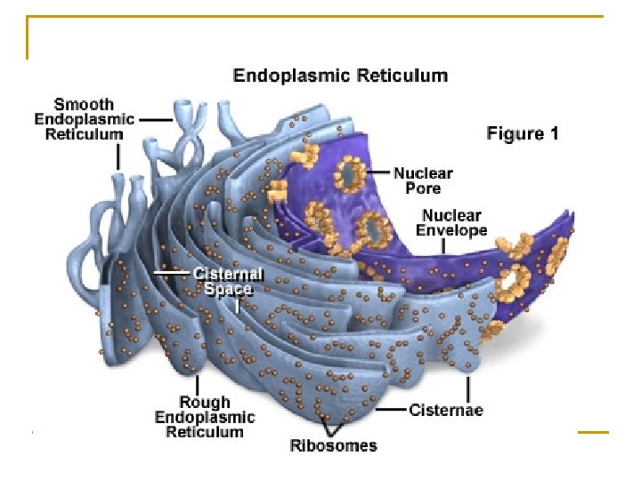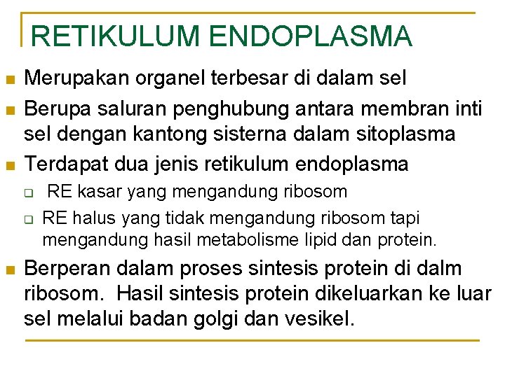 RETIKULUM ENDOPLASMA n n n Merupakan organel terbesar di dalam sel Berupa saluran penghubung antara membran inti sel dengan kantong sisterna dalam sitoplasma Terdapat dua jenis retikulum endoplasma q q n RE kasar yang mengandung ribosom RE halus yang tidak mengandung ribosom tapi mengandung hasil metabolisme lipid dan protein. Berperan dalam proses sintesis protein di dalm ribosom. Hasil sintesis protein dikeluarkan ke luar sel melalui badan golgi dan vesikel.