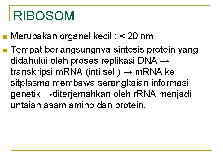 RIBOSOM n n Merupakan organel kecil : < 20 nm Tempat berlangsungnya sintesis protein yang didahului oleh proses replikasi DNA → transkripsi m. RNA (inti sel ) → m. RNA ke sitplasma membawa serangkaian informasi genetik →diterjemahkan oleh r. RNA menjadi untaian asam amino dan protein.