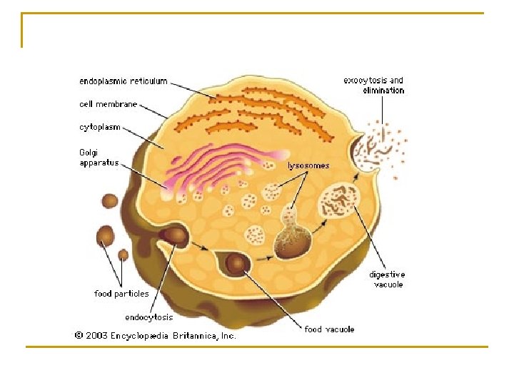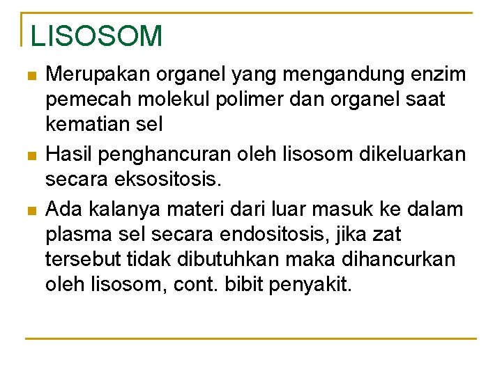 LISOSOM n n n Merupakan organel yang mengandung enzim pemecah molekul polimer dan organel saat kematian sel Hasil penghancuran oleh lisosom dikeluarkan secara eksositosis. Ada kalanya materi dari luar masuk ke dalam plasma sel secara endositosis, jika zat tersebut tidak dibutuhkan maka dihancurkan oleh lisosom, cont. bibit penyakit.
